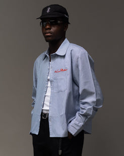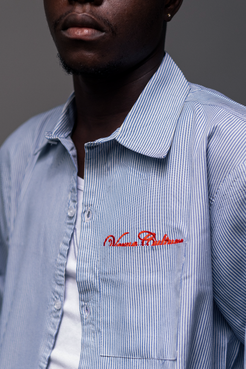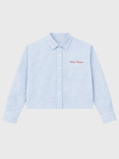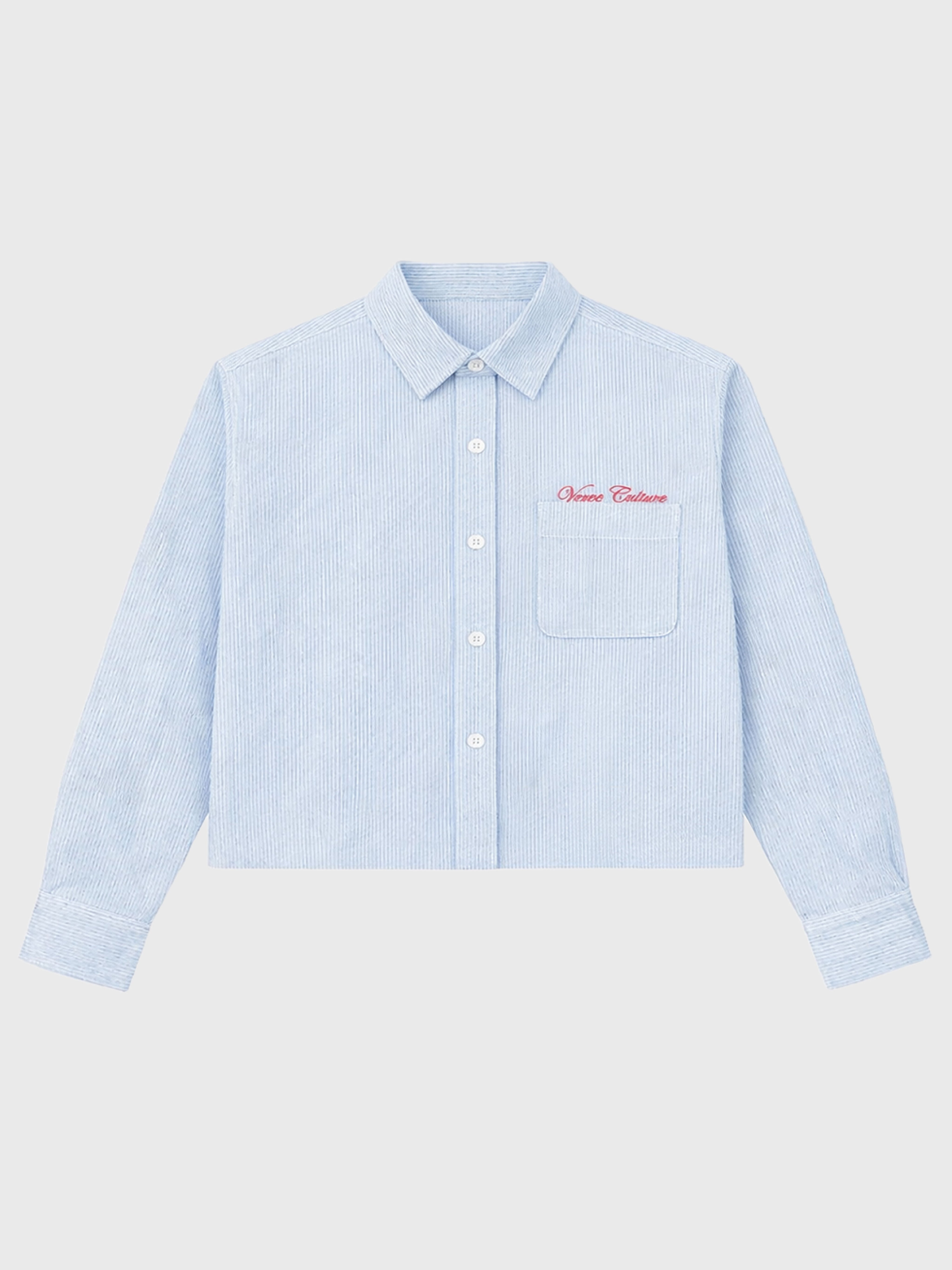 Made from lightweight, fine blue and white pinstripe fabric, this cropped piece delivers a clean, classic look with a modern twist. The front features a neatly stitched chest pocket with bold red script Verve Culture embroidery, adding a distinctive signature detail.