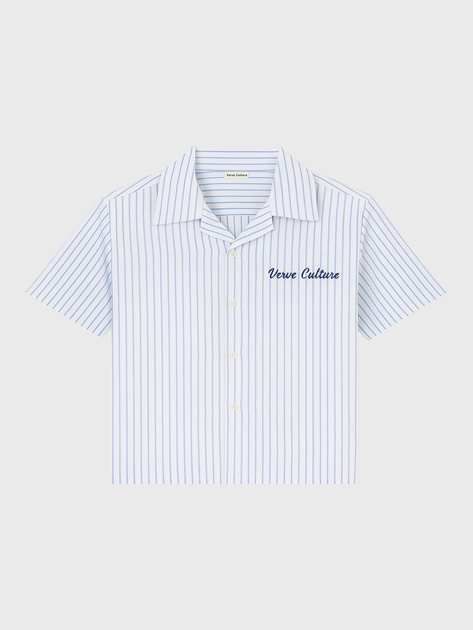 Blue striped cutton fabric.Embroidered Verve Aesthetic branding on chest and back.Relaxed, comforable fit.Button-down...