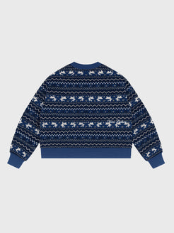 Crewneck is a navy winter sweater featuring white reindeer and snowflake patterns, soft knit fab...