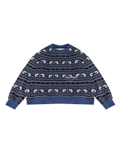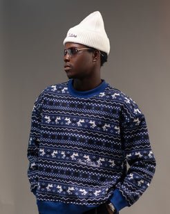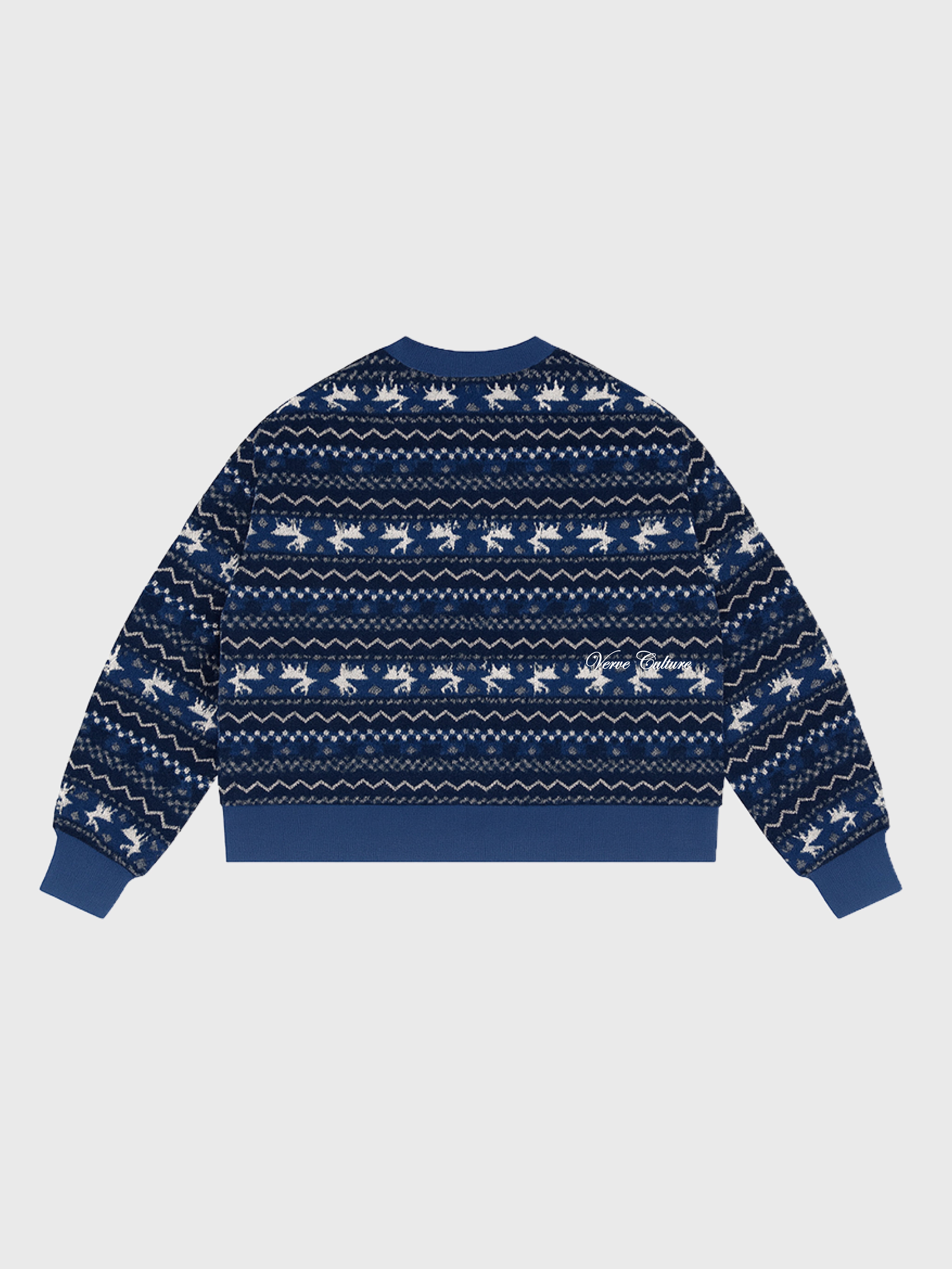 Crewneck is a navy winter sweater featuring white reindeer and snowflake patterns, soft knit fabric, ribbed trims, and Verve culture embroidery. Perfect for cold weather and holiday styling.